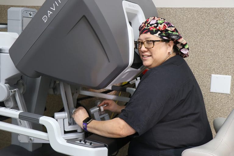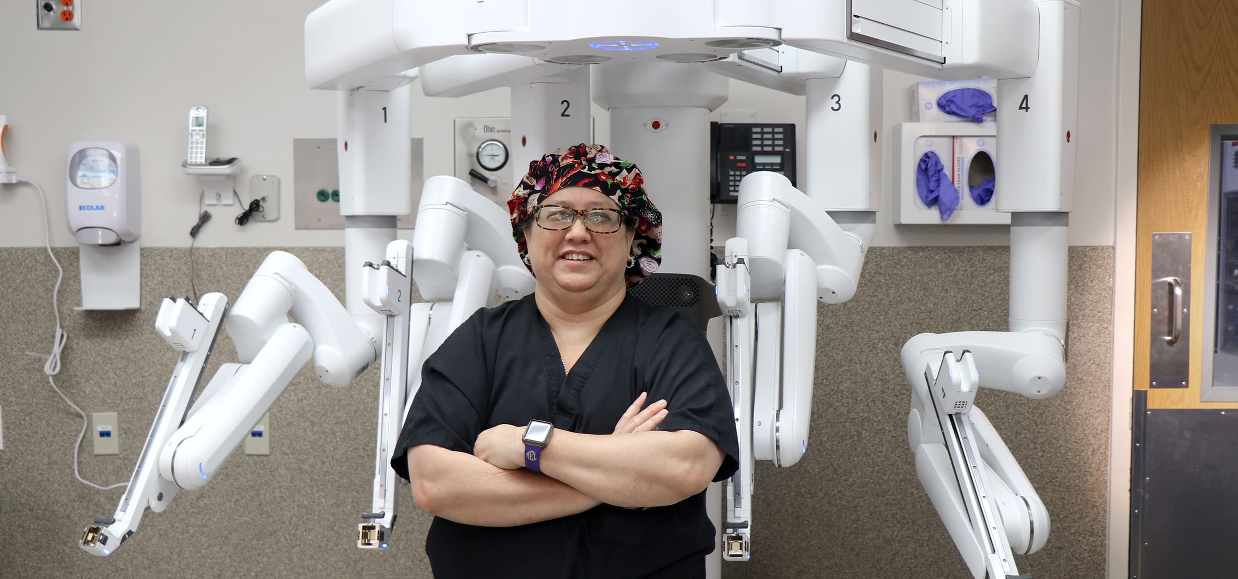 General Surgeon Michelle Eckert has been with Jefferson Regional for 22 years and has performed thousands of operations during that time. Now she has a new partner, of sorts: the daVinci Xi Robot Assisted Surgical System, which was designed to advance minimally-invasive technique across a wide spectrum of surgical procedures.