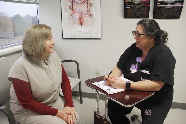 Dr. Eckert (right) visits with patient Stephanie Pooree following Stephanie’s surgery with the daVinci system.