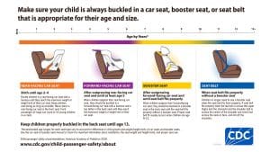 Make sure children are properly buckled up in a car seat, booster seat, or seat belt, whichever is appropriate for their age, height and weight.